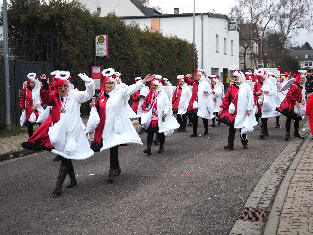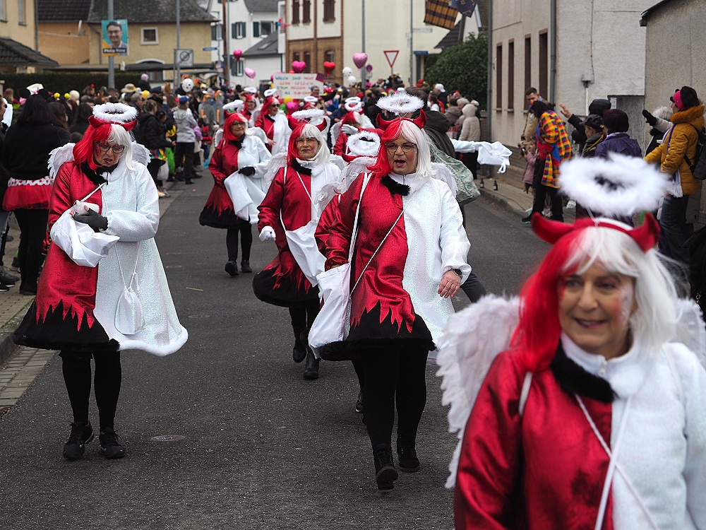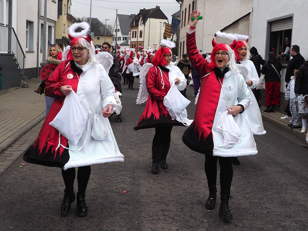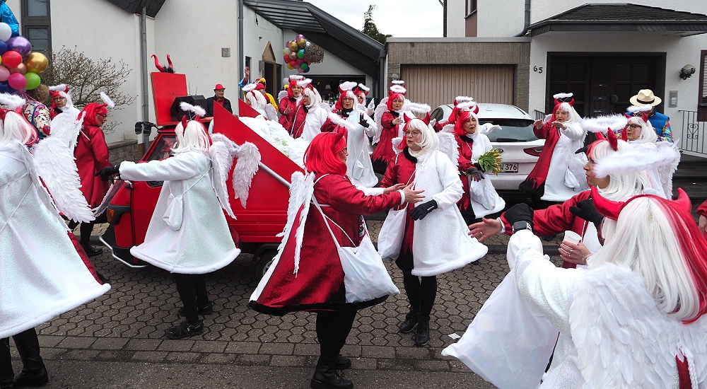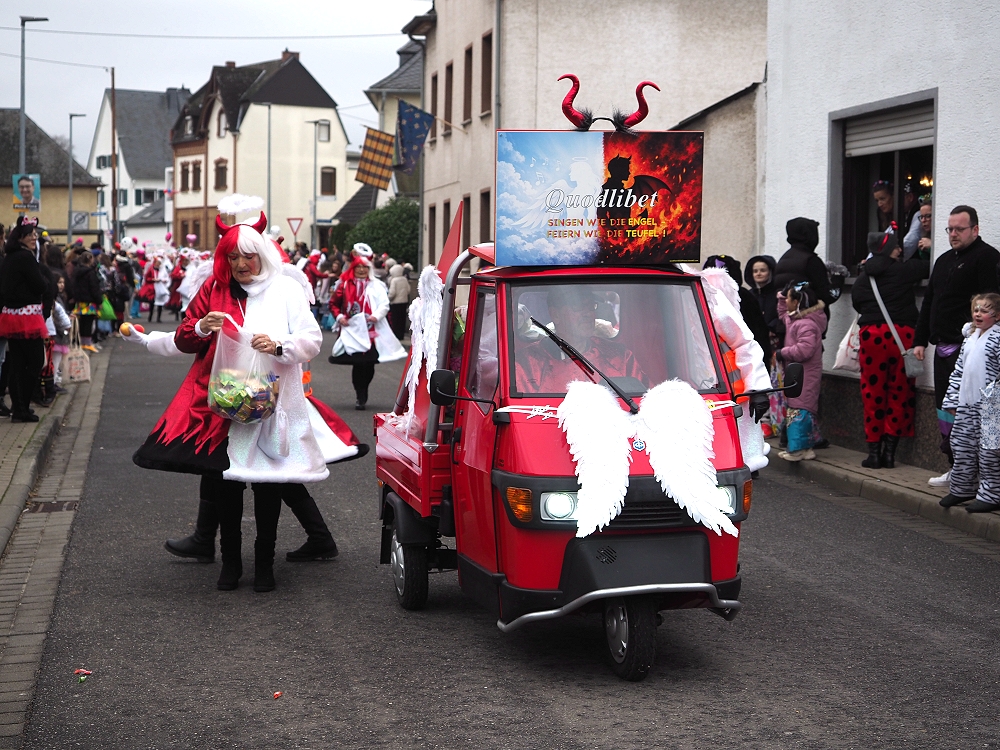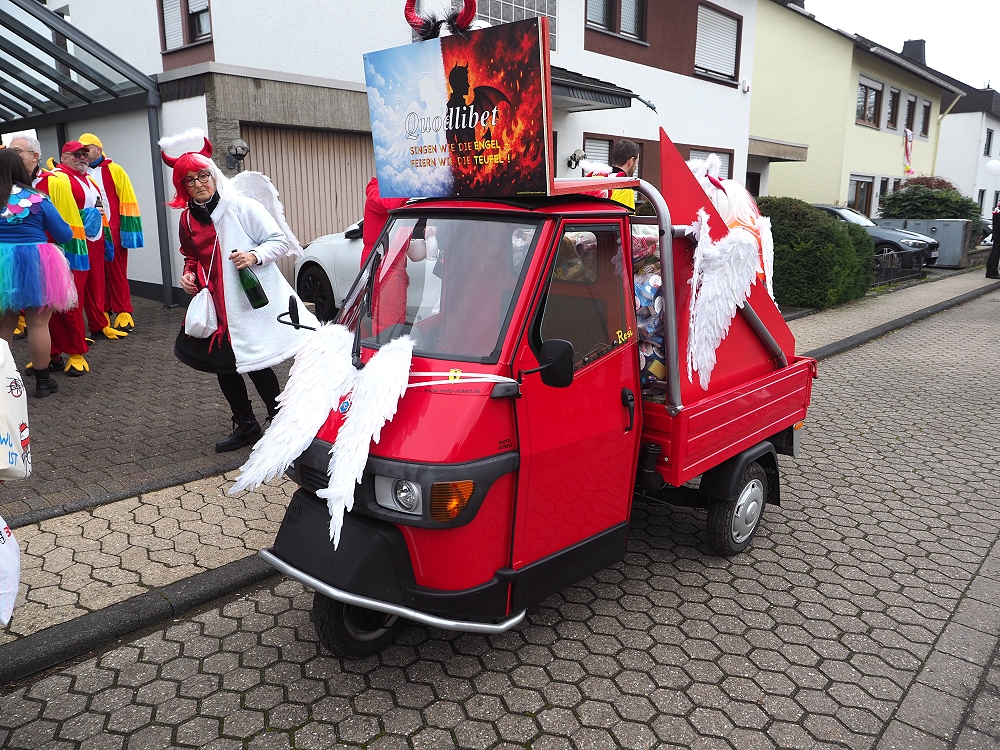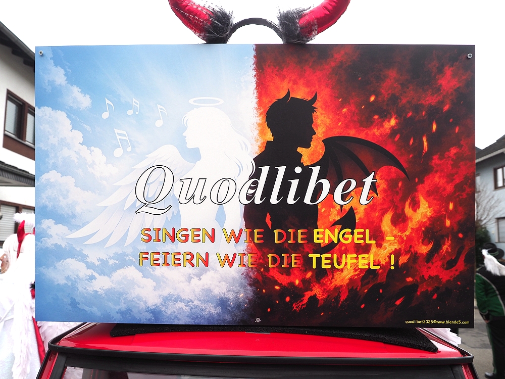 Obwohl die Temperaturen an Karnevalsamstag alles andere als „Engelhaft“ waren, hatten wir beim Karnevalsumzug durch Rübenach wieder einen Heidenspaß daran. Eingekleidet in rotweißen Kostümen waren wir optisch auch ohne Frage als Quodlibet Engelchen ein auffallender Hingugger. Chorleiter „Wolli“ als Teufelsfahrer saß am Steuer unseres mit Wurfmaterial vollgeladenen Teufelsgefährt, worüber in erster Linie die Kids am Straßenrand sich freuten. Der Zug war insgesamt zwar etwas kleiner, der guten Stimmung tat dies aber keinen Abbruch.